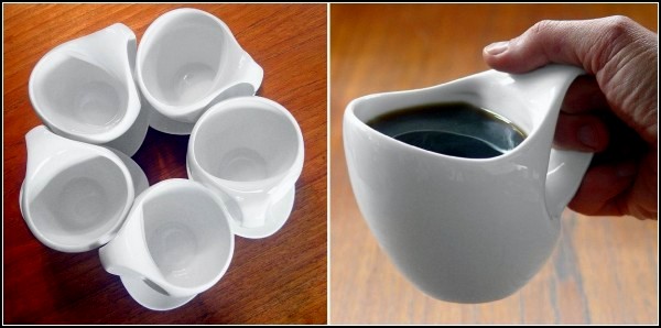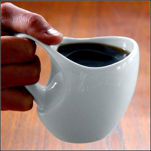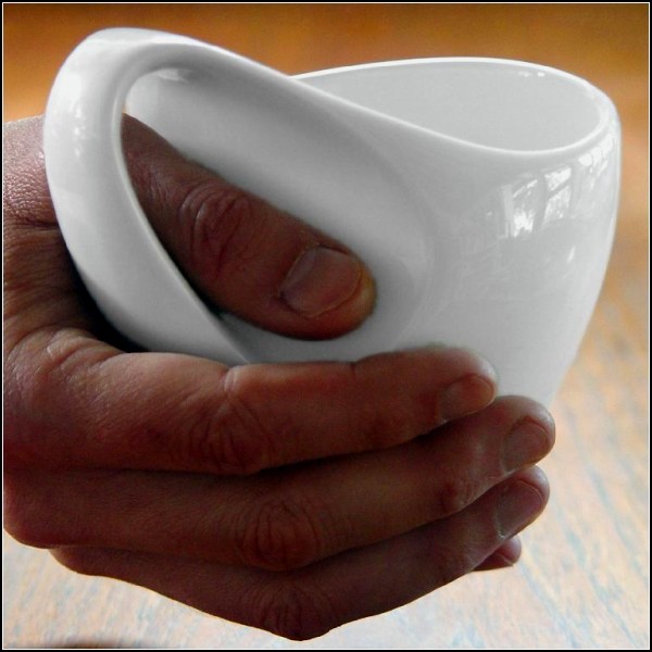 Отклонясь от стандартов, Дэвид Пьер создал свою Ultimate Coffee Cup, форма которой подстроена под форму руки и рта, а также учел соотношения веса кружки и жидкости, которая будет находиться внутри. Так, волнистый край кружки лучше прилегает к губам пьющего и благодаря этому напиток не будет проливаться. А овальная форма самого сосуда переносит центр тяжести ближе к руке, стало быть,держать кружку будет удобно, даже если она полная горячего кофе.