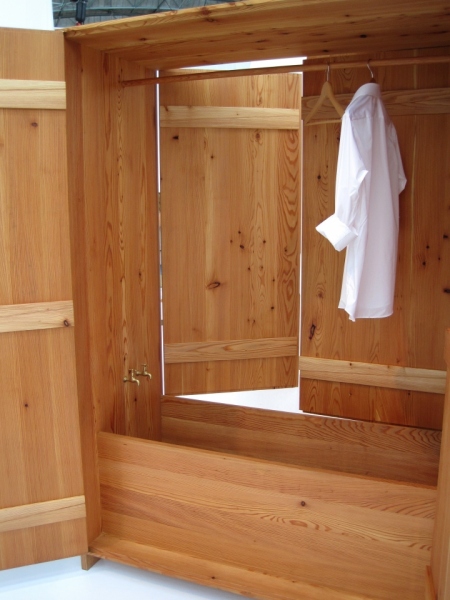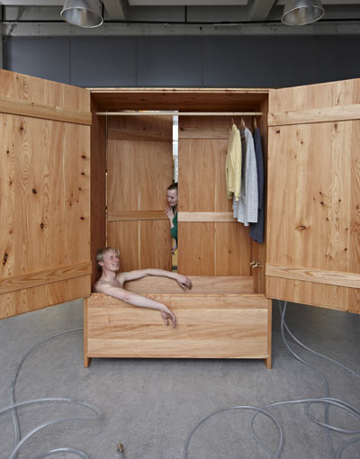 Этот большой "шкаф" выполнен из древесины лиственницы. В верхней части открывающейся с обеих сторон деревянной конструкции расположена штанга для одежды, а внизу поместилась объемная ванна со встроенными в стенку шкафа смесителями.