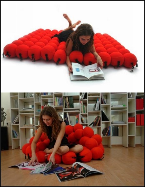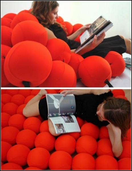 Не кровать, а скорее ковер, матрас из 80-ти мягких шариков, который, впрочем, можно свернуть и сделать креслом, пуфиком, подушкой.